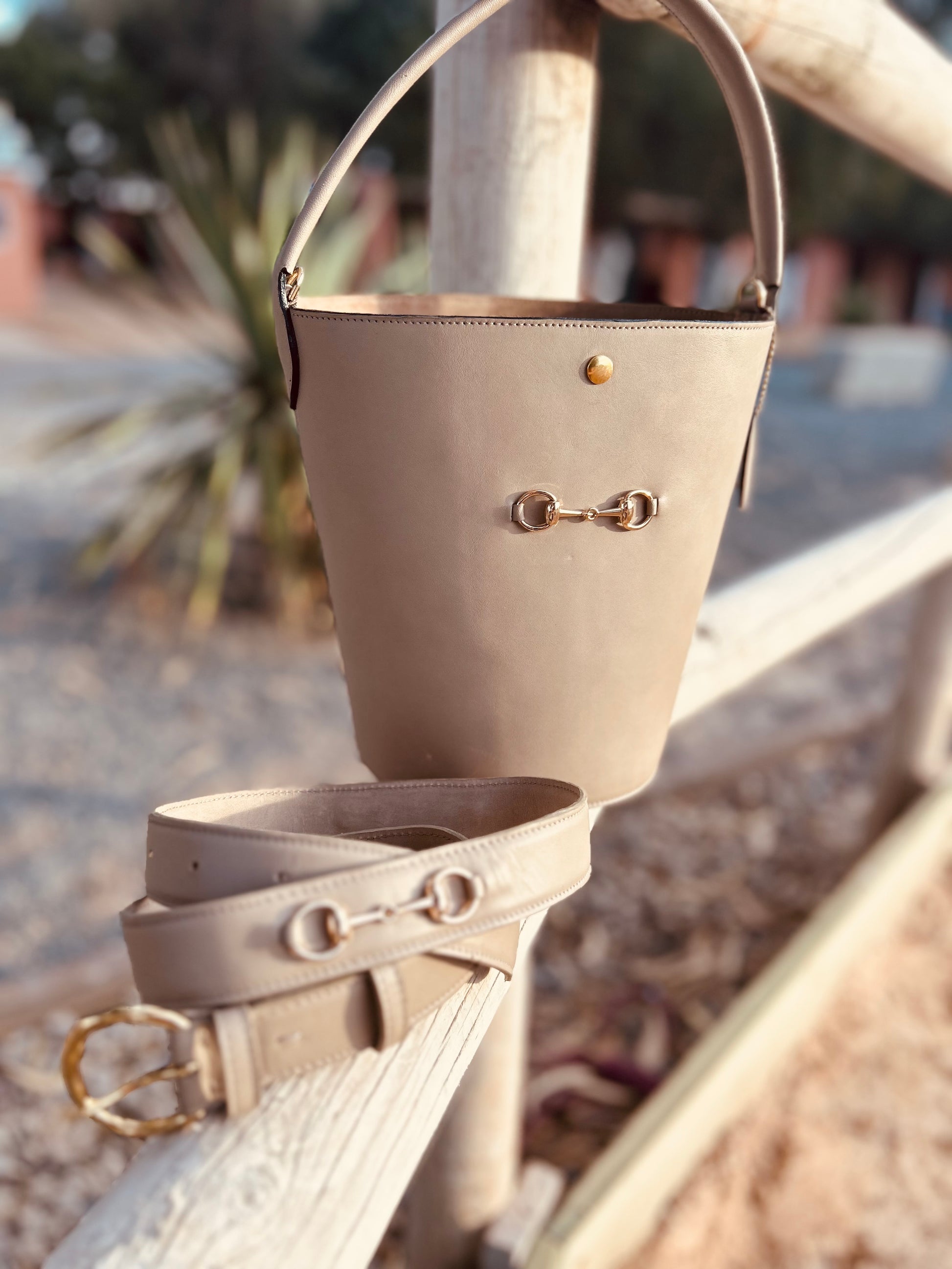 Le seau Diane taupe cuir vachette vert est le nouveau modèle de cette année  2024 - 2025 il devient un modèle incontournable de la collection , il est doublé en daim avec une poche , et une bandoulière amovible , il peut se porte main ou épaule .